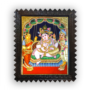Painting is one of the best forms of art and celebrated all over the world. Tanjore style of paintings tracing back to 1600AD are well admired and decorated by many. These paintings are mostly of hindu deities. Here is a portrait of lord shiva (para brahman) and his family. This handmade painting reminds you of the bonding between the members of the family and love. 22ct gold foils are embedded along with fine cut gemstones, giving life to the picture. Painting stays intact within a frame made of special chettinad Teak wood. The frame can be replaced and gives you freedom to choose. Grab this wonderful artefact and fill your beautiful homes with the divine energy of the Parabrahman and Parameshwari and their children Ganesha and Karthikeya.